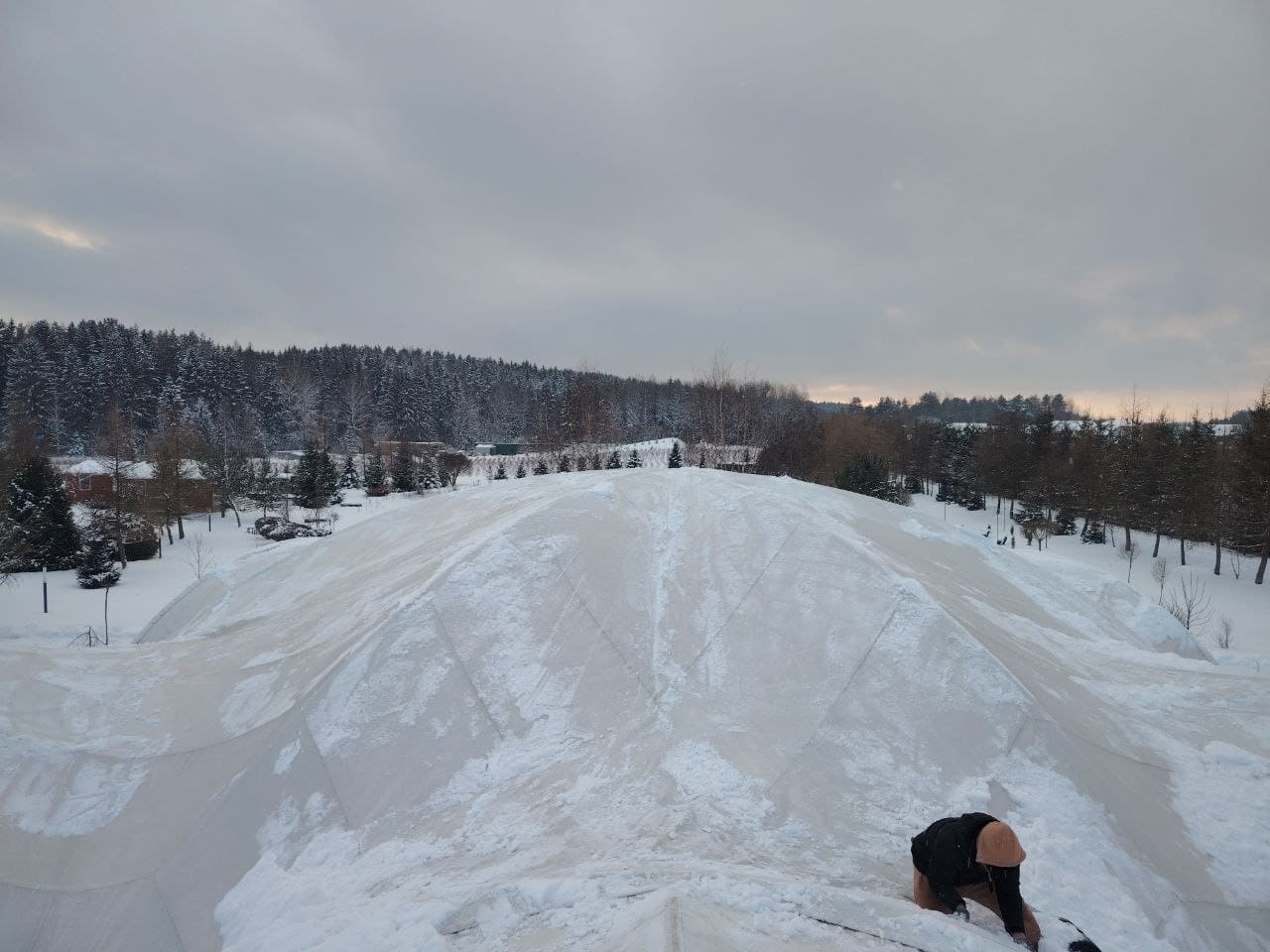 Снег на тентовом покрытии – это не просто «слой сверху», а реальная нагрузка на конструкцию. При оттепелях и повторных заморозках снег быстро уплотняется, превращается в тяжёлую массу и местами образует наледь. Современные арочные шатры и тентовые ангары рассчитаны на определённые снеговые нагрузки, но при накоплении и уплотнении снега вес может вырасти в разы.