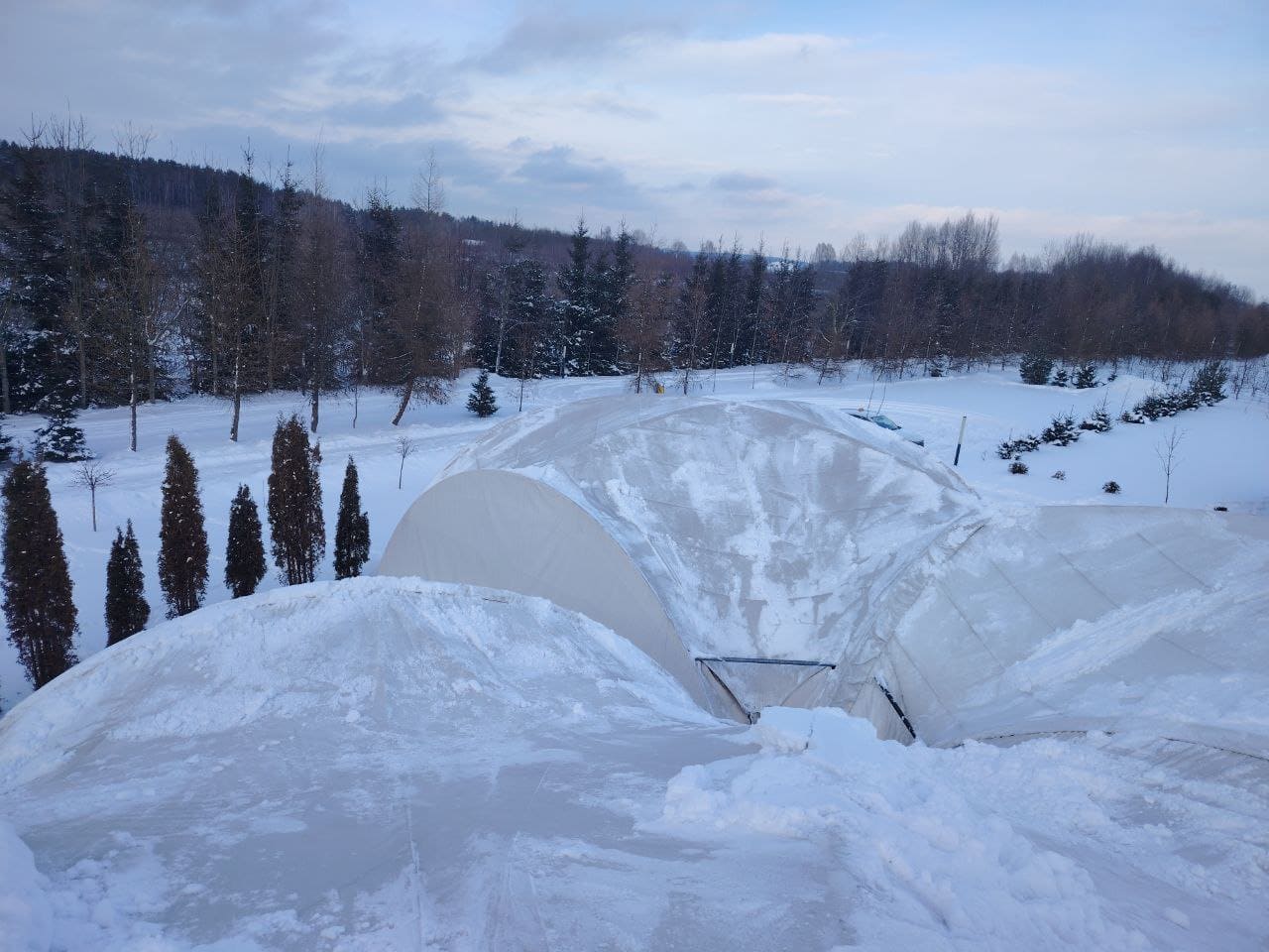 - провисания тента и образования «карманов», где снег копится ещё быстрее;